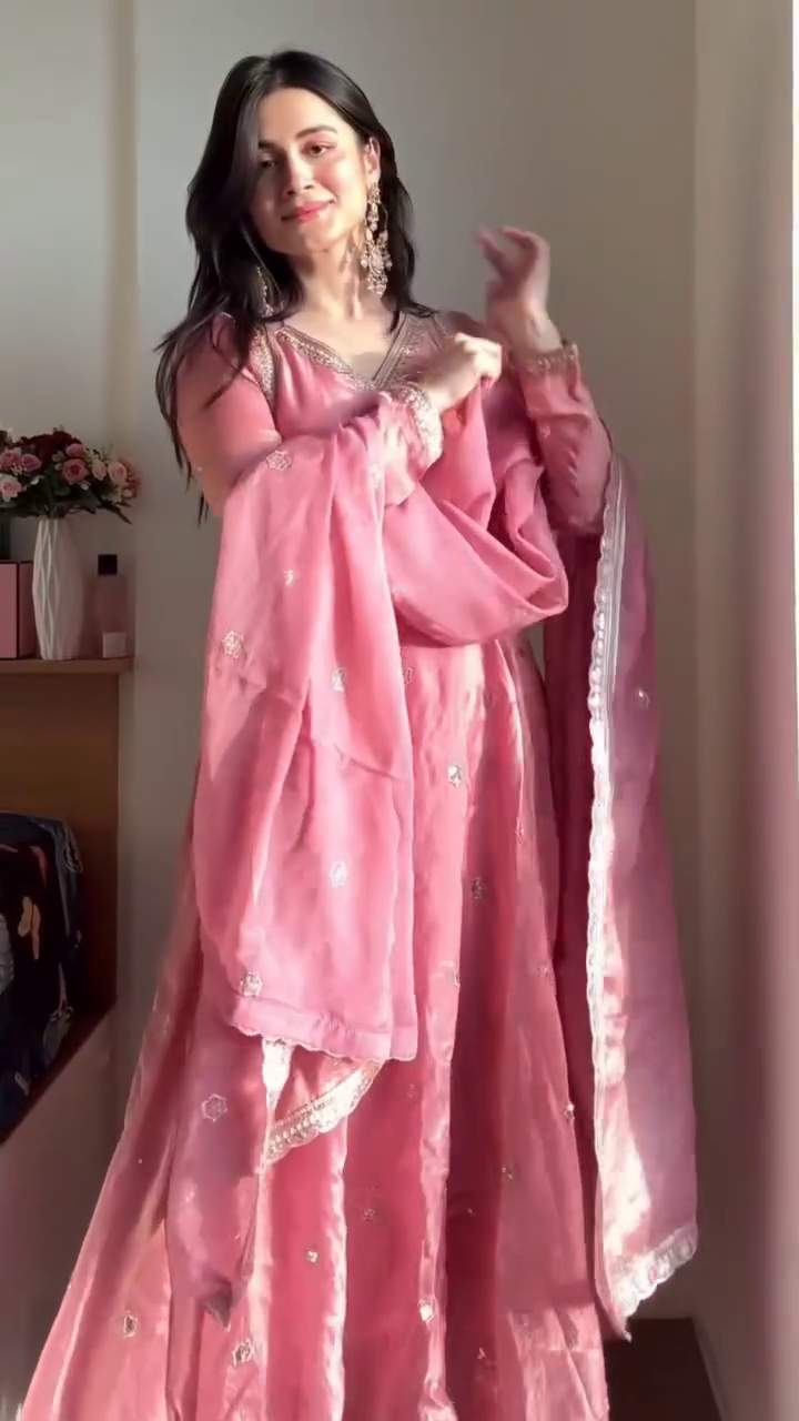 Perfect for weddings, engagement ceremonies, festive gatherings, sangeet nights, and special occasions, this blush pink suit blends traditional aesthetics with modern elegance. Style it with statement earrings and heels for a truly ethereal appearance.