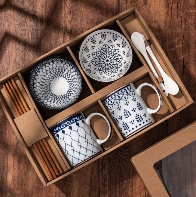 Bring timeless charm to your table with this beautifully crafted blue & white ceramic set 💙✨ Featuring stylish mugs, bowls, chopsticks, and spoons, all neatly packed in a premium gift box, this set blends elegance with functionality.