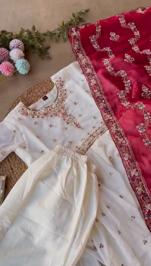 If you are looking for an outfit that combines traditional embroidery, elegant colors, and versatile styling, this Ivory Embroidered Kurta Set with Red Dupatta is a must-have addition to your ethnic collection. Celebrate heritage, craftsmanship, and timeless beauty with this effortlessly graceful ensemble.