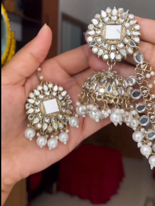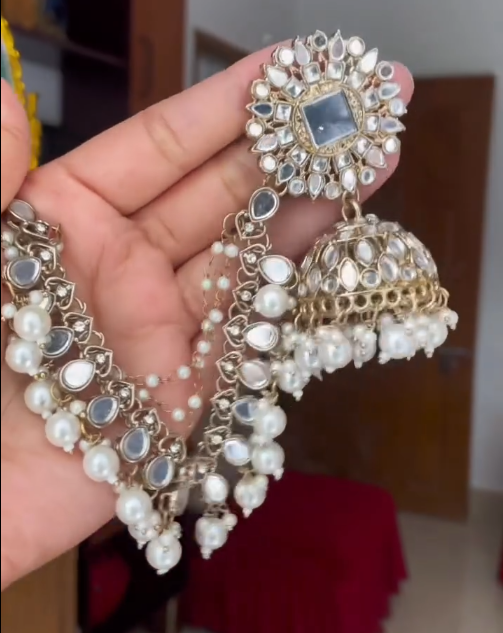 Suspended below is a stunning jhumka dome, adorned with detailed kundan work and finished with clusters of soft white pearls. The pearl drops add movement and a traditional aesthetic, creating a graceful sway with every step. This combination of kundan stones and pearls reflects the heritage of royal Indian jewelry, making these earrings a true showstopper.