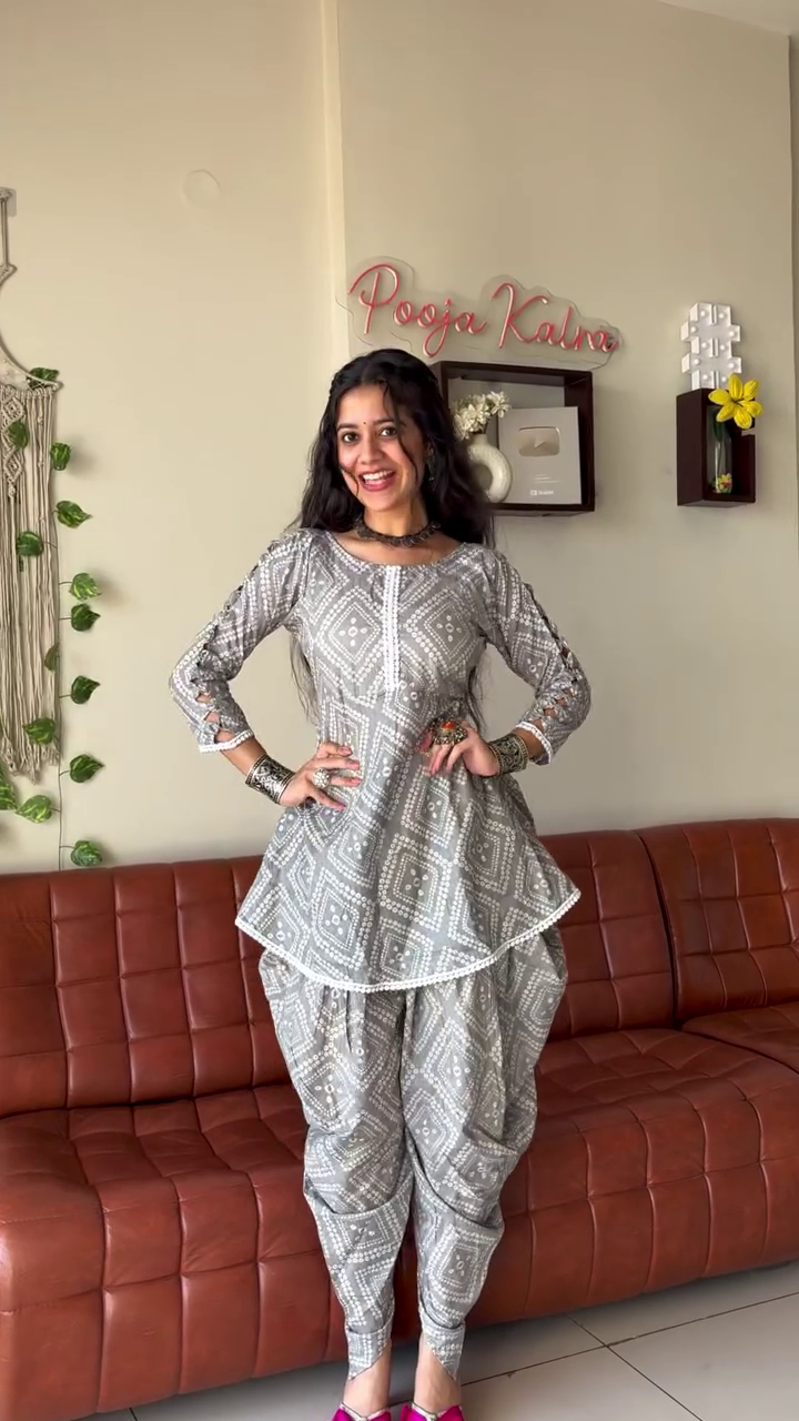 Step into effortless ethnic elegance with this grey printed co-ord set featuring a beautifully patterned kurti paired with matching dhoti-style pants. This modern Indo-fusion outfit blends traditional motifs with a contemporary silhouette, making it perfect for festive gatherings, casual celebrations, and stylish day events. The short flared kurti with geometric ethnic prints adds structure and charm, while the coordinated draped dhoti bottoms bring comfort and trend-forward appeal. Paired with oxidized jewelry and bangles, the overall look creates a balanced mix of classic and modern Indian fashion. Ideal for women looking for ethnic co-ord sets, printed kurti dhoti sets, Indo-western festive wear, and comfortable traditional outfits. This ensemble works great for festive styling, small functions, cultural events, and fashion content creation. The soft grey palette keeps the look sophisticated and versatile while allowing accessories to stand out. A perfect pick for anyone searching for trendy ethnic co-ords that are both comfortable and statement-making.