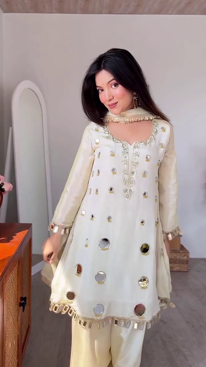 A woman exudes charm and poise in a beautifully tailored ivory traditional outfit adorned with delicate gold embellishments and reflective mirror details. She gracefully drapes a matching dupatta with subtle gold trim, adding movement and sophistication to the look. Paired with statement earrings and a warm smile, the ensemble blends understated luxury with timeless cultural style, perfectly complemented by the soft natural light and cozy interior setting.