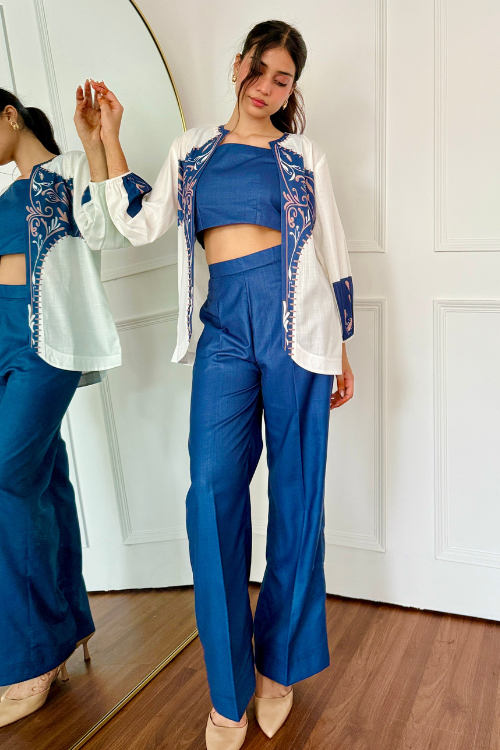 A refined balance of structure and softness, this ensemble pairs the deep, moody richness of dark tones with the crisp brightness of a white overlay, creating a modern contrast that’s equal parts classic and contemporary.