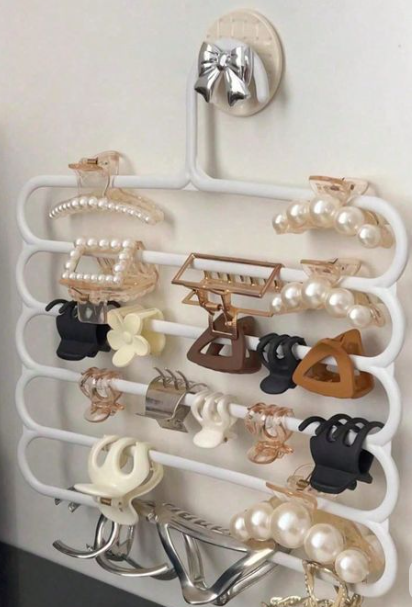 Keep your hair accessories neatly organized with this wall-mounted hair accessories organizer. Designed with multiple bars and hooks, it provides plenty of space to store hair clips, claw clips, scrunchies, headbands, and small accessories. The wall-mounted design helps save space while keeping your accessories easily visible and accessible.