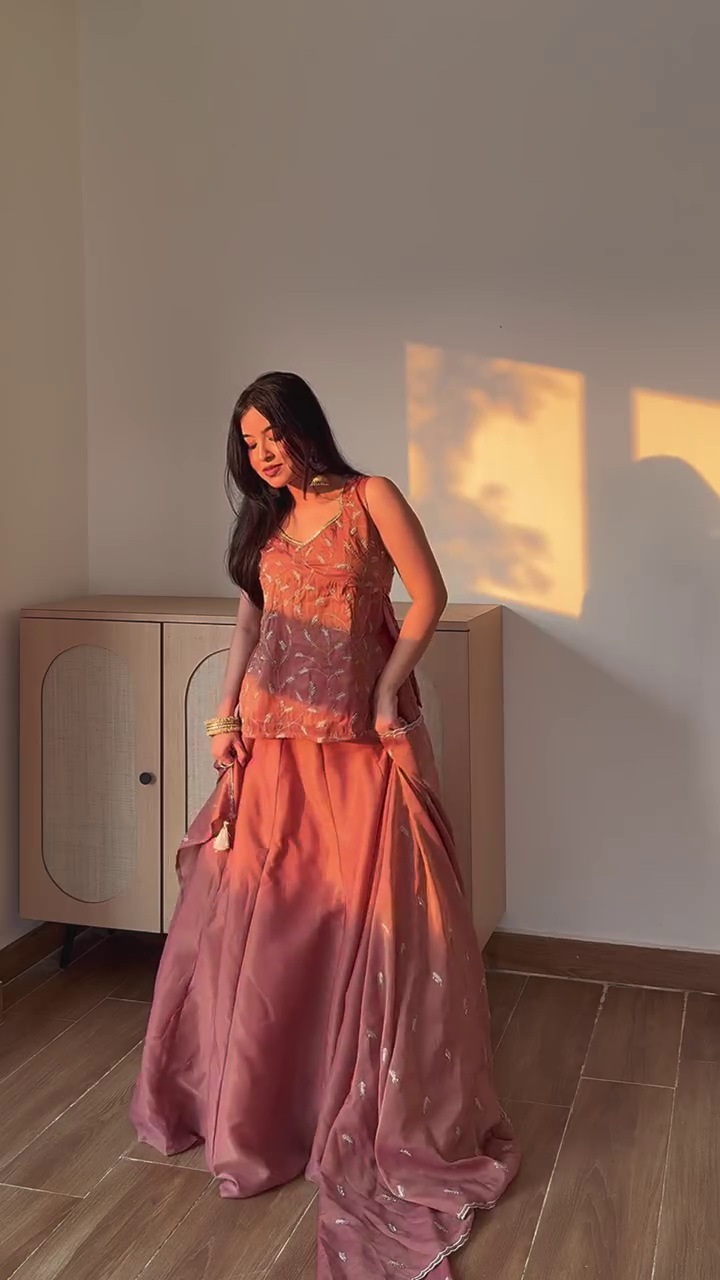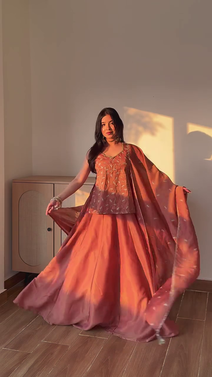 A stunning peach-toned ethnic lehenga set featuring a sleeveless embroidered blouse paired with a flowing lehenga skirt and matching dupatta. The blouse is adorned with delicate floral and traditional embroidery, adding elegance and charm, while the voluminous skirt drapes beautifully for a graceful silhouette. Soft, lightweight fabric and subtle embellishments make this ensemble perfect for festive occasions, weddings, engagements, and celebrations. The warm peach hues and refined detailing create a timeless, sophisticated look ideal for special events.