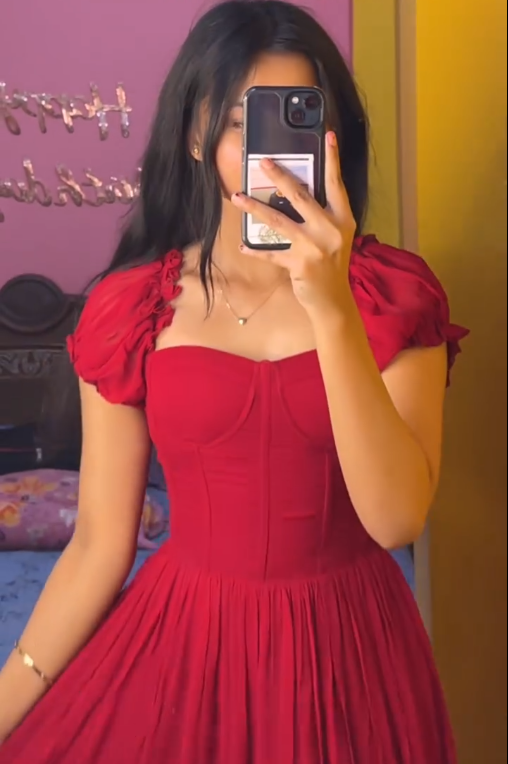 Elegant red puff sleeve fit and flare dress with a structured bodice and flowy skirt, perfect for date nights, parties, and festive styling. A romantic statement outfit that creates a flattering silhouette and eye-catching mirror selfie look.