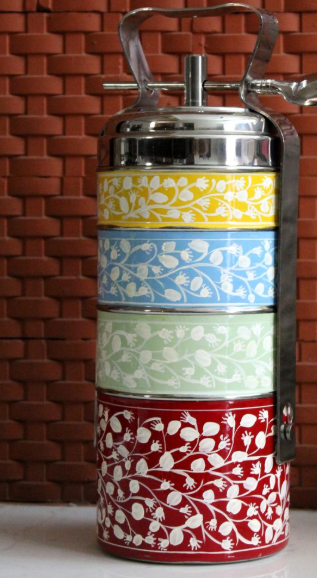 Traditional Stainless Steel 4-Tier Tiffin Box – Printed Lunch Carrier
