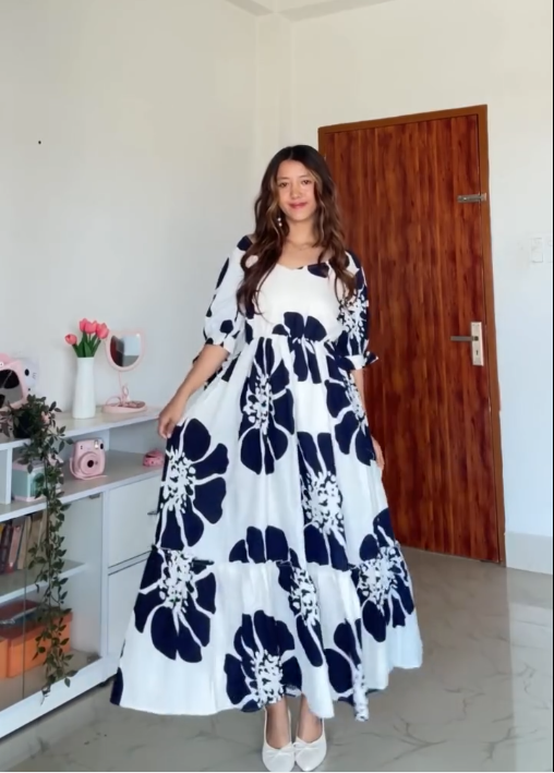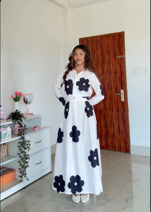 Make a statement with this white maxi dress featuring bold black floral prints. Designed for comfort and elegance, this flowy dress is perfect for casual days, brunch outings, or relaxed festive occasions. Style it with flats or heels for a timeless, modern look.