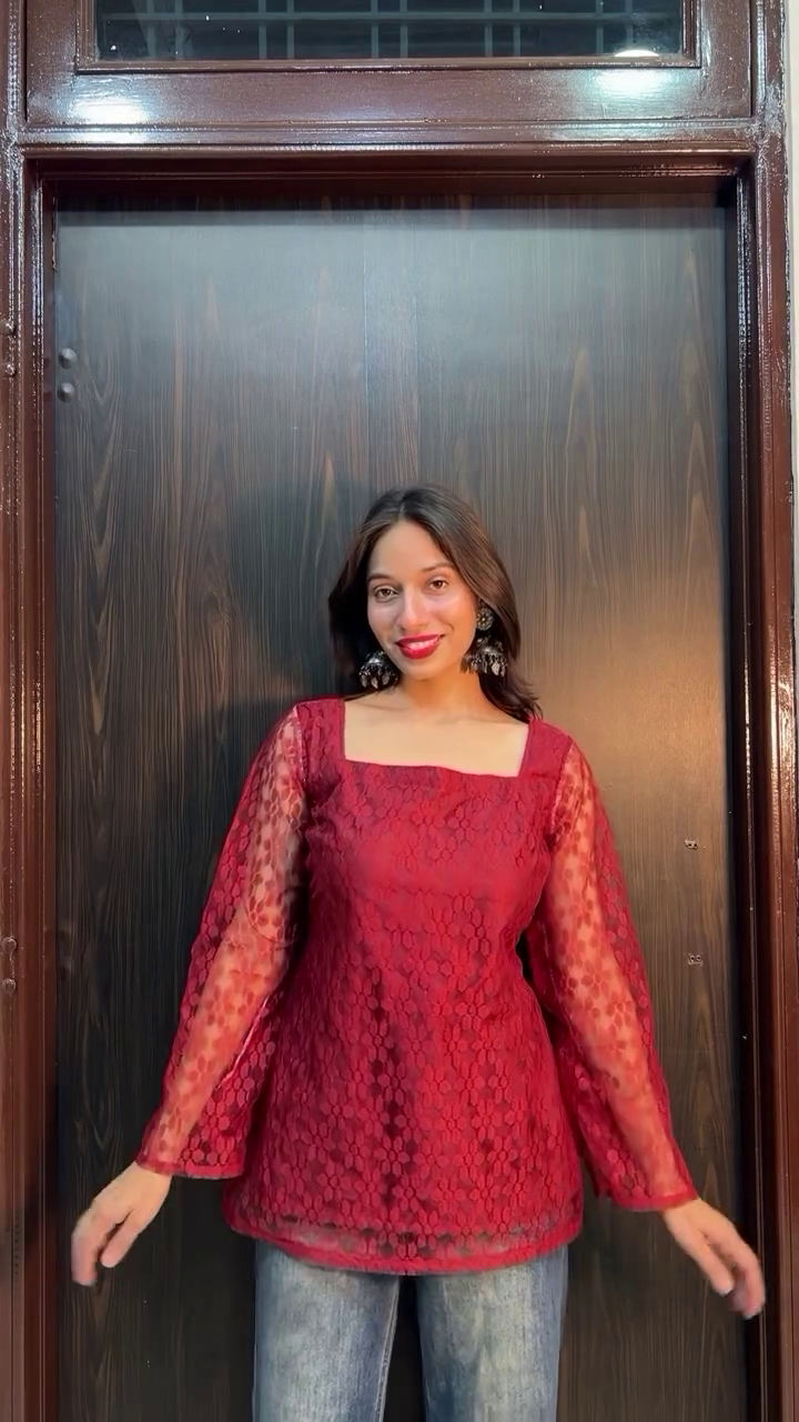 The tunic is designed with a flattering square neckline that enhances the neckline area while giving the outfit a modern and stylish touch. The relaxed silhouette flows comfortably around the body, making it suitable for all-day wear. The slightly flared hem adds a subtle peplum-style shape that gives the top a graceful and trendy appearance.