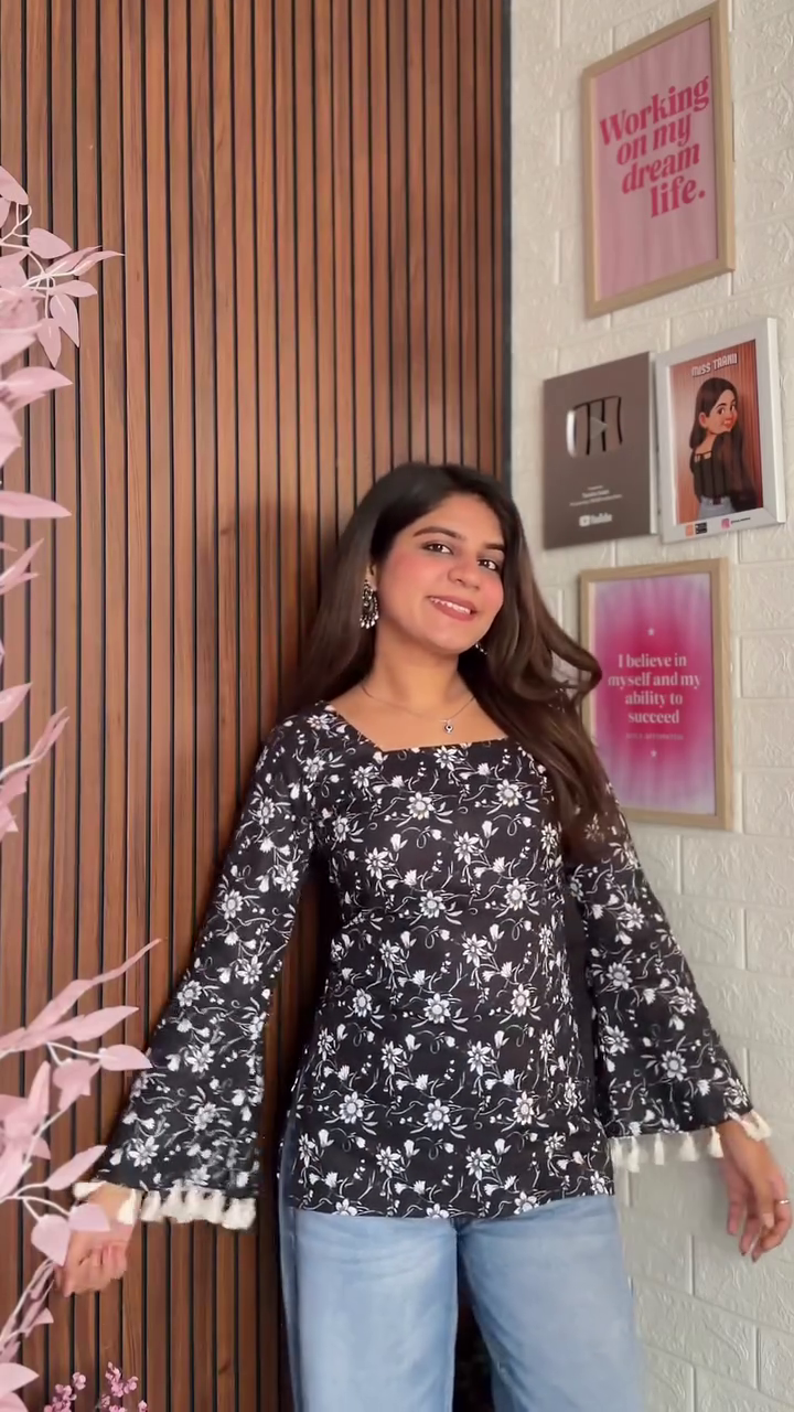 The standout feature of this kurti top is its stylish bell sleeves with tassel detailing. The flared sleeves add a trendy, feminine touch while the subtle tassels enhance its ethnic aesthetic. The classic round neckline offers a clean and flattering finish, making this top suitable for women of all ages. The straight yet slightly relaxed fit allows easy movement while complementing different body types.